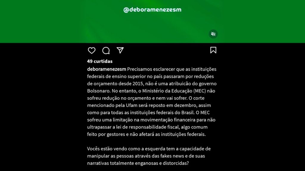 Pelo menos dois políticos do Amazonas, dentre eles um deputado federal e uma deputada estadual eleitos pediram em postagens, na internet, que a população “não caia em fake news”, ou dizendo que essa seria mais uma narrativa da “esquerda”.
