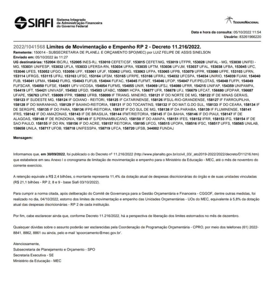 “Com o bloqueio de hoje, seguramente nossas ações de Assistência Estudantil também serão afetadas, pois, não temos mais lastro para bloquear em outras ações que já vêm sofrendo com cortes e bloqueios ao longo dos últimos 6 (seis) anos. Tememos pela diminuição dos auxílios estudantis, dos projetos integrais e recursos para os restaurantes estudantil e transporte de alunos”, relata.