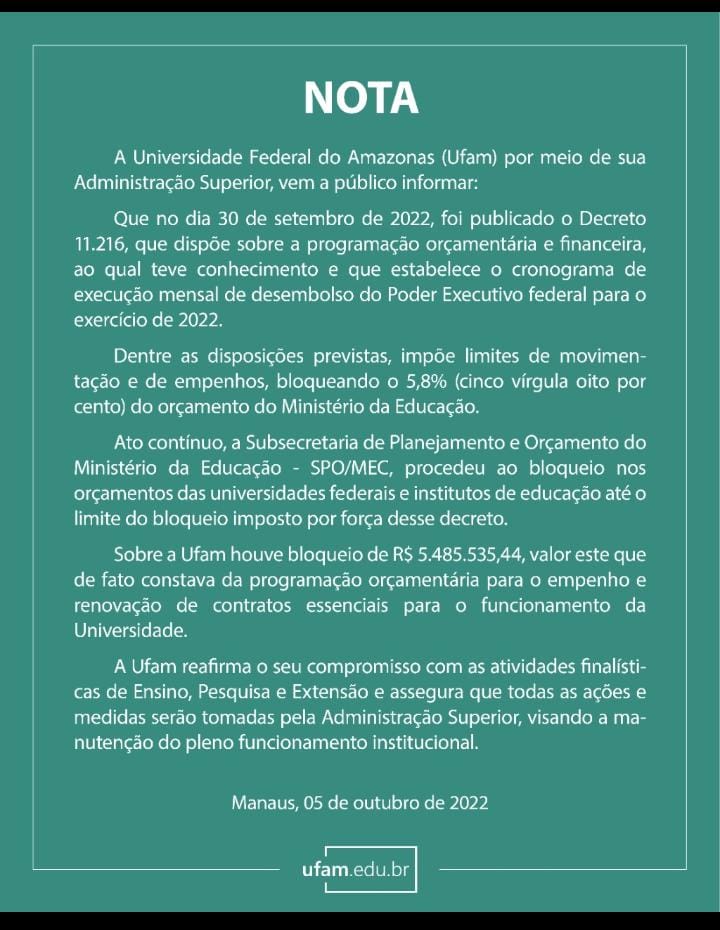 “O Instituto Federal do Amazonas lamenta muito os diversos cortes e bloqueios que o orçamento da Rede Federal sofreu ao longo de 2022. Ações de ensino, pesquisa, extensão, inovação, infraestrutura e
