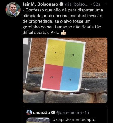 Em resposta, Bolsonaro disse: “confesso que não dá para disputar uma olimpíada, mas em uma eventual invasão de propriedade, se o alvo fosse um gordinho do seu tamanho não ficaria tão difícil acertar”. Ele também publicou a foto de um alvo de papel com marcas de tiros.