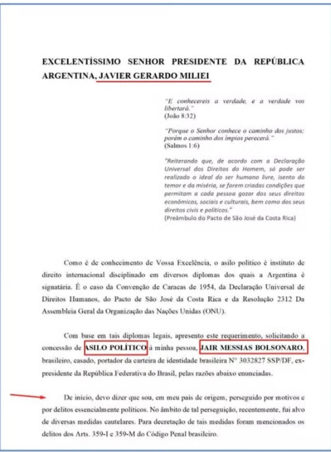 O pedido de asilo político, inicia com citações da bíblia como o de João capítulo 8, versículo 32 “Conhecereis a verdade e a verdade vos libertará”, no segundo trecho Bolsonaro escreve o Salmos 1:6 “Porque o senhor conhece o caminho dos justos porém o caminho dos ímpios perecerá”.