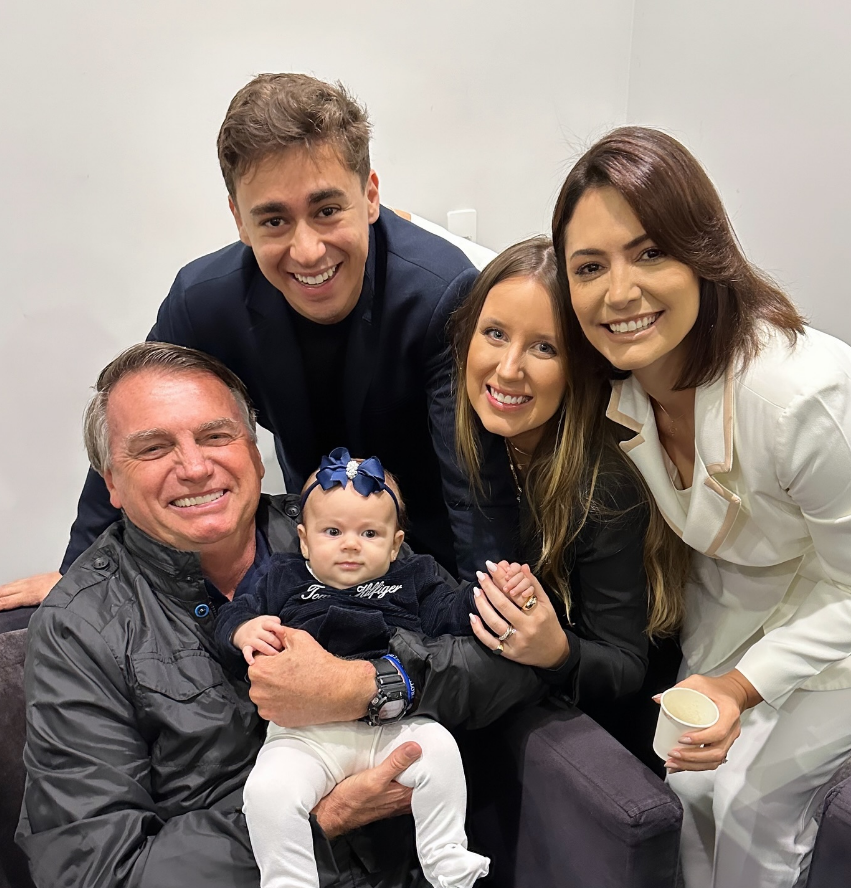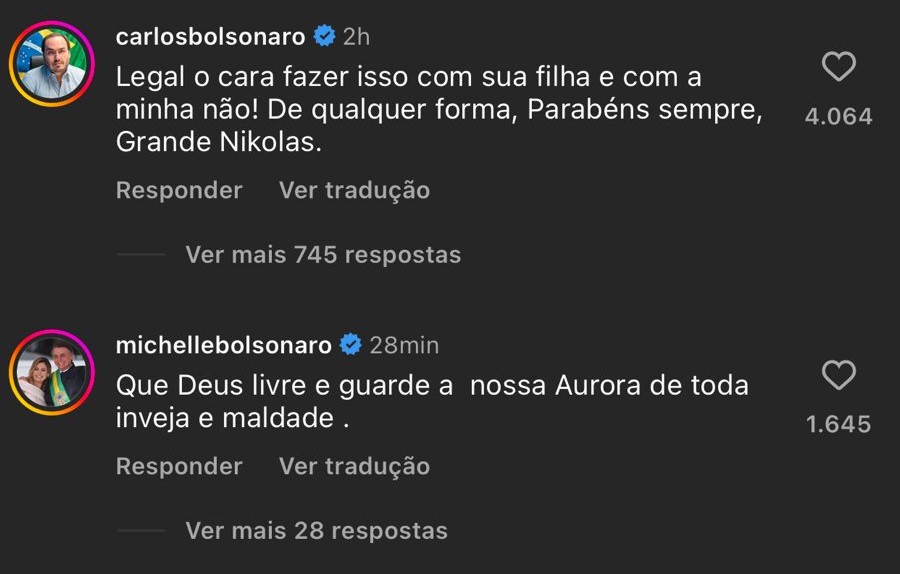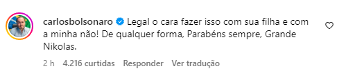 Na publicação, Nikolas aparece ao lado da esposa e do casal Jair e Michelle Bolsonaro. O ex-presidente segura a filha de Nikolas, sorrindo. A imagem não agradou “Carluxo”, que respondeu: “Legal o cara fazer isso com sua filha e com a minha não! De qualquer forma, Parabéns sempre, Grande Nikolas”.