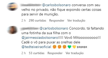 Internautas responderam o comentário inesperado de um dos três irmãos da família Bolsonaro: “Conversa com seu velho no privado”, rebateu um seguidor. O “03”, como Carlos Bolsonaro é conhecido, ainda repostou o mesmo comentário em uma rede social vizinha, repercutindo ainda mais a opinião.