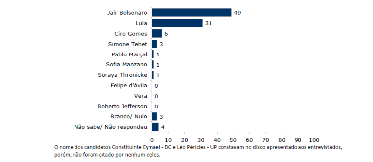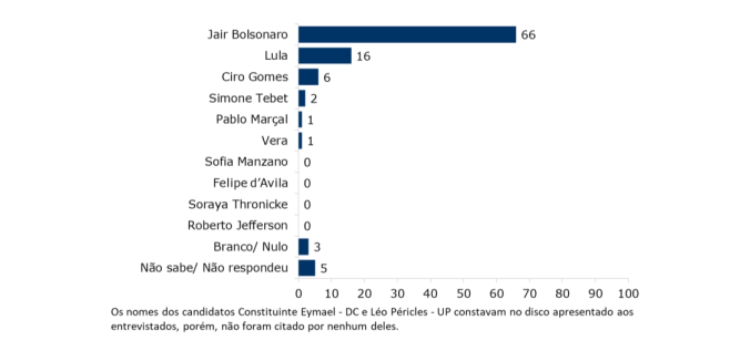 Nesta questão, os nomes de Constituinte Eymael, Léo Péricles, Sofia Manzano e Soraya Thronicke constavam no disco apresentado aos entrevistados, porém, não foram citados. Eleitores que têm intenção de votar em branco ou anular o voto eram 3% e aqueles que não sabem ou preferem não opinar totalizaram 4%.