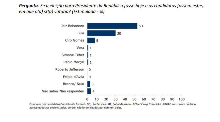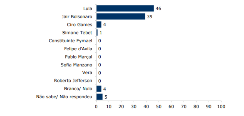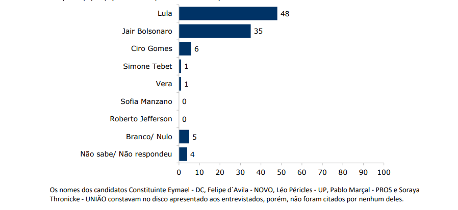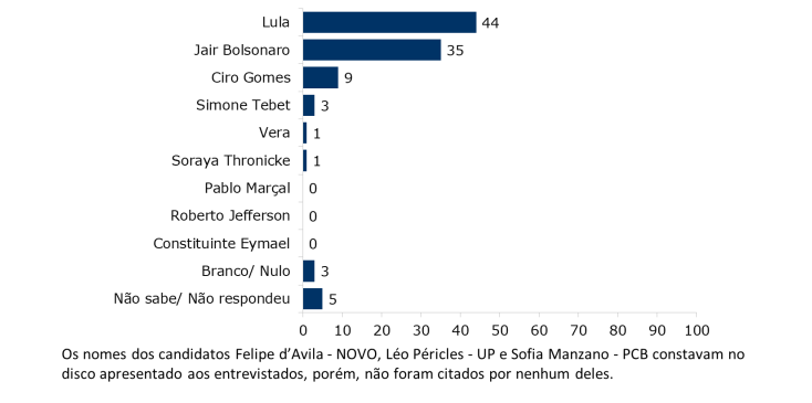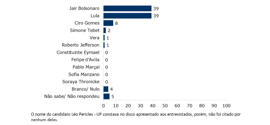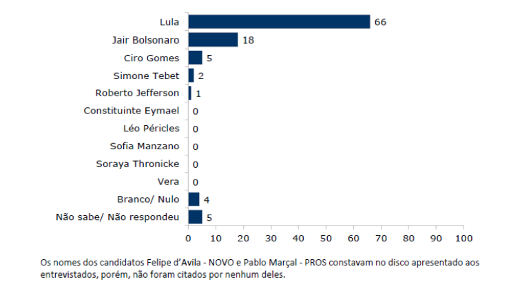 Felipe d’Avila, Vera e Roberto Jefferson são citados, mas não atingem 1% das intenções de voto cada. Nesta questão, os nomes de Constituinte Eymael e Léo Péricles (UP) constavam no disco apresentado aos entrevistados, porém, não foram citados. Aqueles com intenção de votar em branco ou anular o voto para presidente somaram 3% e os que não sabem ou preferem não opinar totalizaram 4%.