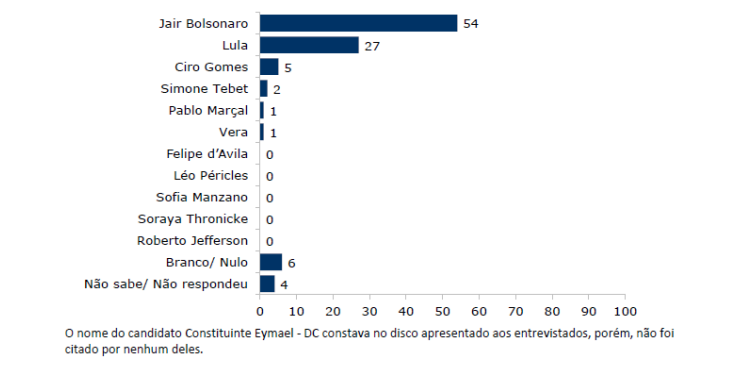 Thronicke e Roberto Jefferson foram citados, mas não atingem 1% das intenções de voto, cada. Nesta questão, o nome de Constituinte Eymael constava no disco apresentado aos entrevistados, porém, não foi citado.