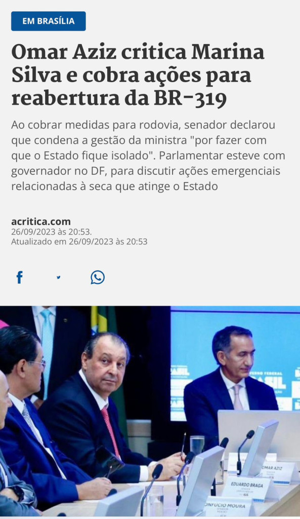 Diferentemente da agressividade verbal usada para Marina Silva, o senador Omar Aziz, que fazia oposição ao Governo Bolsonaro, em 2021, pediu para o líder do governo no Senado, Fernando Bezerra, à época, conversar com o então ministro de Infraestrutura, Tarcísio de Freitas, hoje, governador de São Paulo, para fazer a BR-319, conforme matéria publicada no site BNC.