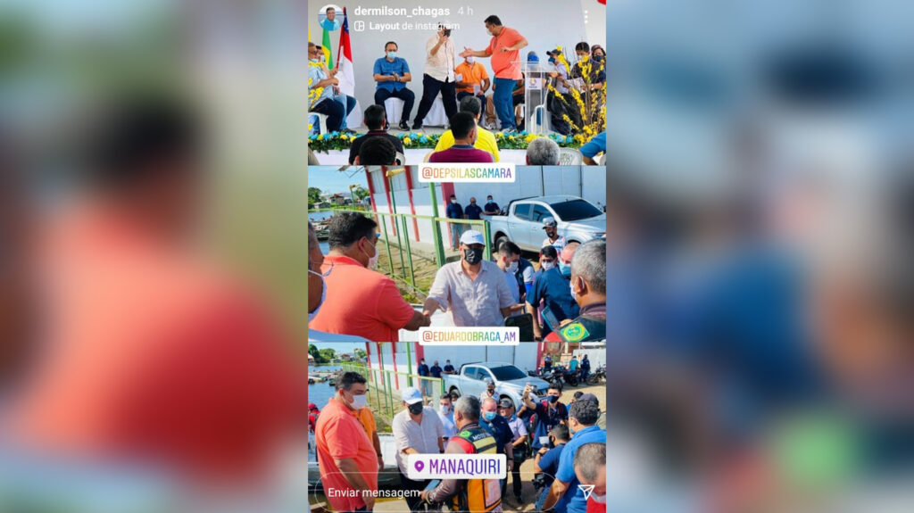 Em fotos divulgadas nas redes sociais, Braga aparece ao lado de apoiadores e abraçando o prefeito da cidade, Jair Solto (MDB), e do deputado federal Silas Câmara (Republicanos), além de outros parlamentares e populares.
