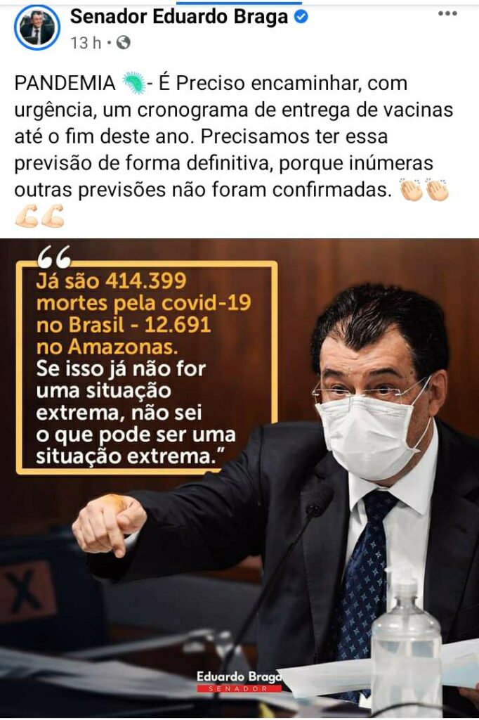 Nos bastidores e o membro da CPI da Pandemia, Braga é visto como um pré-candidato a governador do Amazonas, expectativa referendada pelo deputado Silas Câmara, que publicou um vídeo nesta sexta, antecipando um possível lançamento do senador ao governo. “Começando a nossa agenda, hoje, sexta-feira, comigo aqui o nosso governador Eduardo Braga. Vamos para Manaquiri”, declarou, em vídeo publicado no Instagram, enquanto apresenta os políticos que seguiam trajeto ao município.