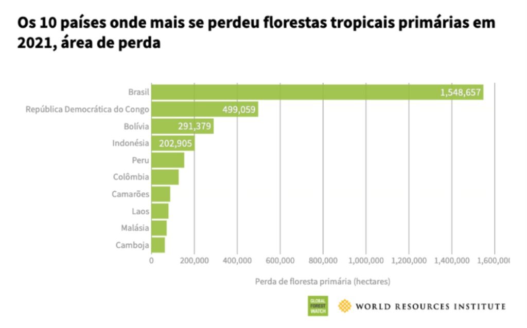 Ao todo, o GFW identificou a perda de 3,75 milhões de hectares de florestas tropicais primárias no mundo. Para além do Brasil, chama a atenção a perda de matas em países como Bolívia e República Democrática do Congo, que registraram aumento com relação a 2020. Já a Indonésia registrou redução das taxas de perda florestal pelo quinto ano consecutivo, indicando que políticas públicas do governo da Indonésia e comprometimentos do setor privado no país estão surtindo efeito.