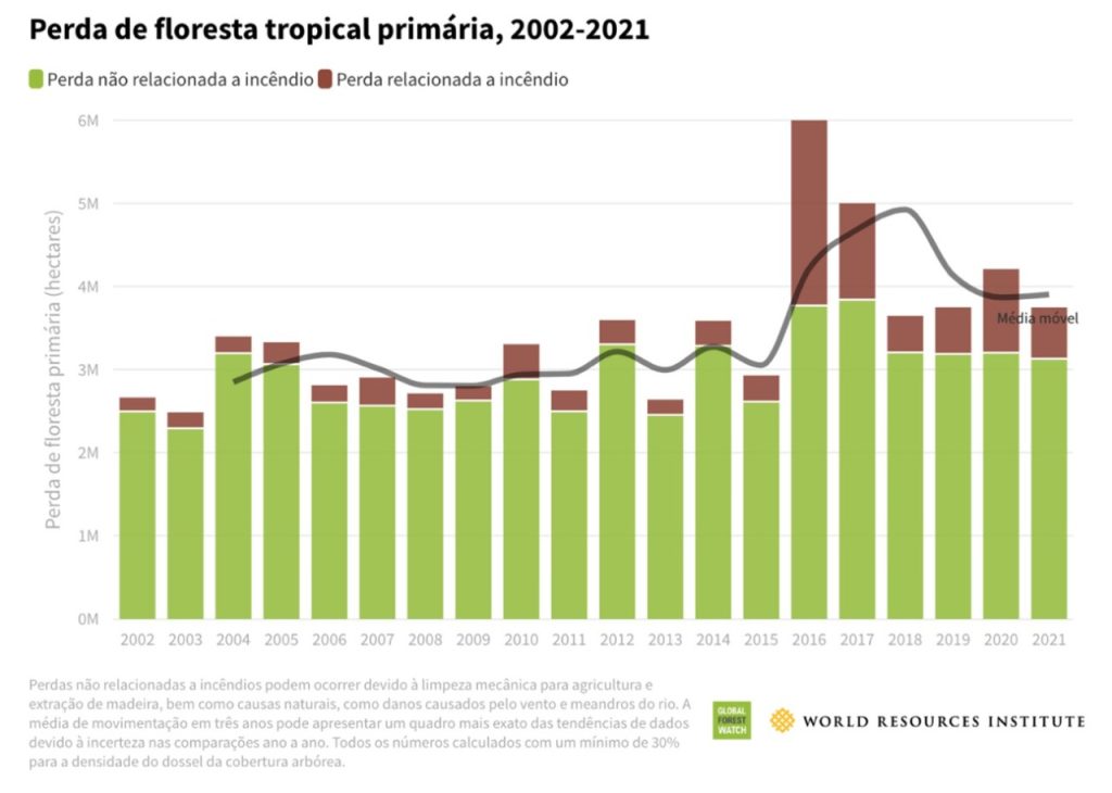O Brasil detém cerca de um terço das florestas tropicais primárias remanescentes do mundo e tem mantido taxas de perda de florestas primárias acima de 1 milhão de hectares desde 2016, segundo os dados do GFW.