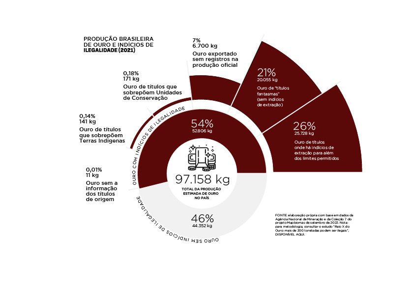 A estimativa do instituto, levando em conta os dados obtidos com a Agência Nacional de Mineração (ANM) e a Rede Mapbiomas, é que no ano passado a produção brasileira de ouro chegou a 97 toneladas. Apenas 46% disso, ou seja, pouco mais de 44 mil quilos, foram produzidos de forma legalizada. Os outros 54% apresentam falhas, seja na comprovação de origem, seja na falta de registro na produção oficial daquilo que foi exportado.