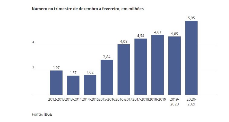 As estatísticas fazem parte da Pesquisa Nacional por Amostra de Domicílios Contínua (Pnad Contínua) e consideram o período do trimestre encerrado em fevereiro de 2020 –antes, portanto, do coronavírus se espalhar pelo Brasil – e o mesmo período de 2021.