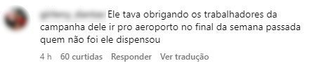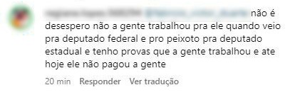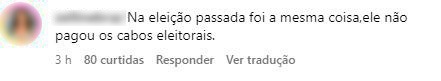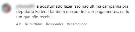 Alguns comentários apontaram, ainda, que o candidato é “acostumado a fazer isso”, e que também não teria pago trabalhadores da campanha de 2022, quando disputou e foi eleito deputado federal pelo Partido Liberal (PL). “A gente trabalhou para ele quando ele veio para deputado federal […] eu tenho provas que ‘a gente trabalhou’ e até hoje ele não pagou a gente”, afirmou um dos comentários.