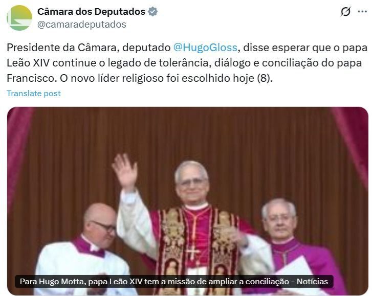“Presidente da Câmara, deputado @HugoGloss, disse esperar que o papa Leão XIV continue o legado de tolerância, diálogo e conciliação do papa Francisco. O novo líder religioso foi escolhido hoje (8)”, dizia o post.