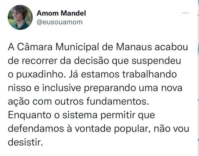 “A Câmara Municipal de Manaus acabou de recorrer da decisão que suspendeu o puxadinho. Já estamos trabalhando nisso e, inclusive, preparando uma nova ação com outros fundamentos. Enquanto o sistema permitir que defendamos à vontade popular, não vou desistir”, declarou Amom, em uma publicação nas redes sociais.
