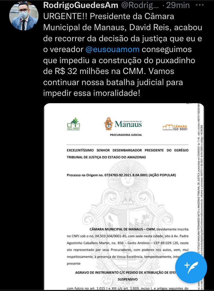 “Urgente!! Presidente da Câmara Municipal de Manaus, David Reis, acabou de recorrer da decisão da Justiça que eu e o vereador @eusouamon conseguimos que impediu a construção do puxadinho de R$ 32 milhões na CMM. Vamos continuar nossa batalha judicial para impedir essa imoralidade.