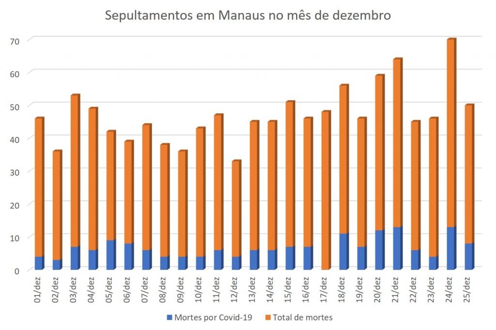 De acordo com a Semulsp, as causas das mortes nos cemitérios públicos da capital do Amazonas na véspera de Natal apontam para 13 declaradas como Covid-19 e nos espaços privados houve o registro de um óbito pelo novo coronavírus, totalizando 14.