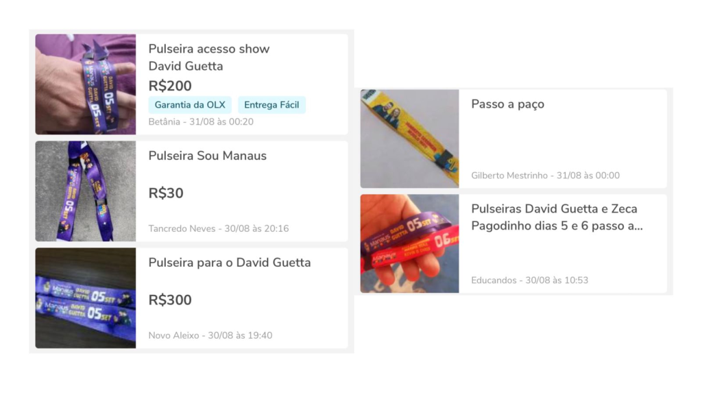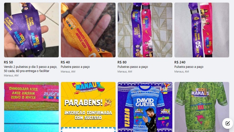 A reportagem identificou ao menos cinco anúncios em apenas uma rede social de vendas, a OLX. Já no Facebook, que possui a plataforma “Market Place”, outros cinco anúncios de pulseiras foram encontrados, além da venda de camisas e brindes que também são distribuídos gratuitamente na loja do #SouManaus, localizada no Shopping Manauara, zona Sul da capital.