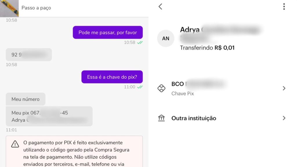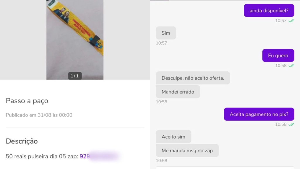 Em uma rápida troca de mensagens foi possível identificar a autora do anúncio, que além de fornecer o número do seu CPF, ainda disponibilizou o contato telefônico para continuar a negociação pelo WhatsApp.
