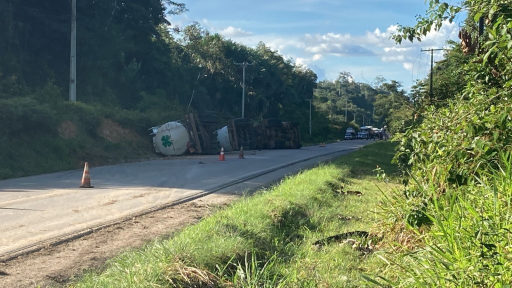 Caminhão que transportava combustíveis tomba na BR-174, entre Manaus e Boa Vista; rodovia foi interditada por risco de explosão