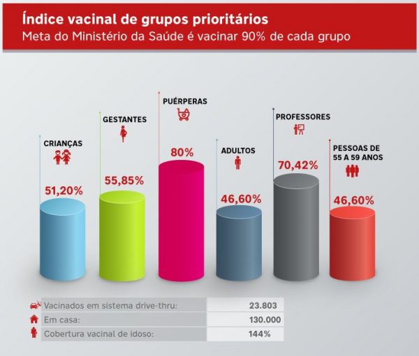 Em relação aos idosos, que foram imunizados pelas equipes nas residências e por meio de um sistema drive-thru, a meta da campanha foi ultrapassada, atingindo 144% do público estimado pelo Ministério da Saúde.