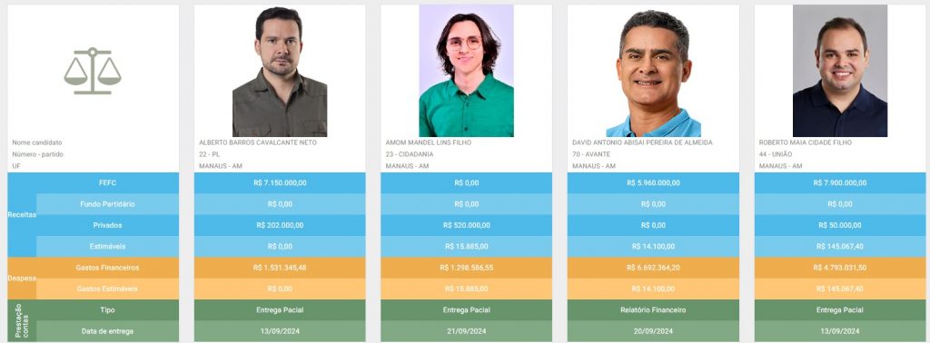 Os dois candidatos divulgaram mais gastos do que receitas em relatórios financeiros encaminhados nesta semana (15 a 21 de setembro) ao Tribunal Regional Eleitoral do Amazonas (TRE-AM). Segundo o TRE-AM, Amom arrecadou R$ 535,8 mil em cinco doações de pessoas físicas e gastou R$ 1,2 milhão. Esse é o maior volume de recursos que precisa ser justificado entre os sete candidatos a prefeito de Manaus.