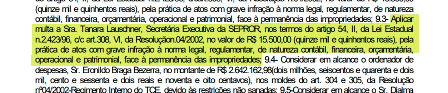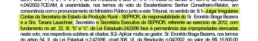 “Julgar irregulares contas da Secretaria de Estado da Produção Rural (Sepror), de responsabilidade do Sr. Eronildo Braga Bezerra e a Sra. Tanara Lauschner, secretário e secretária executiva da Sepror“, diz um trecho do documento.