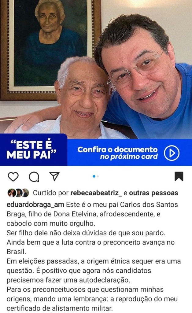 Nessa quinta-feira, 26, Braga postou uma foto na rede social Instagram, ao lado do pai, na qual cita a raiz afrodescendente do genitor. “Este é o meu pai, Carlos dos Santos Braga, filho de Dona Etelvina, afrodescendente, e caboclo com muito orgulho. Ser filho dele não deixa dúvidas de que sou pardo“, declara o senador.