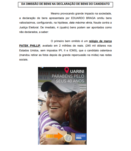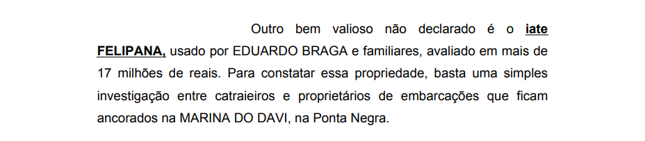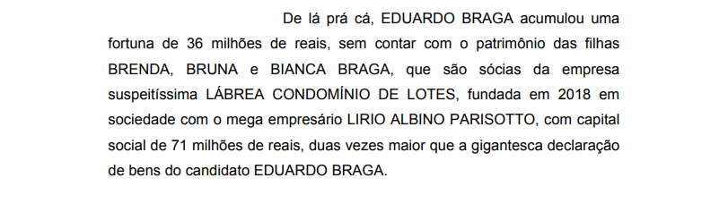Ainda no documento, a ação de impugnação traz outras informações referente ao histórico de bens de Braga. De acordo com a documentação, não se sabe a origem da fortuna do candidato. Ele aponta que Eduardo Braga acumulou uma fortuna de R$ 36 milhões, sem contar com o patrimônio das filhas: Brenda, Bruna e Bianca Braga, sócias da empresa a qual tem sociedade com um empresário renomado, com capital social de R$ 71 milhões. Todos os nomes, Robson Tiradentes (PSC) destacou em maiúsculo.