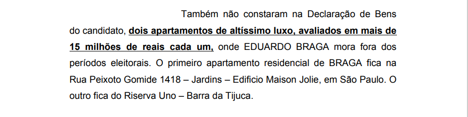 Entre os quatro bens apontados estão um relógio da marca Patek Phillip, avaliado em R$ 2 milhões. Também não consta na declaração de bens do candidato, dois apartamentos classificados de “altíssimo” luxo, avaliados em mais de R$ 15 milhões cada um, onde Braga mora fora dos períodos eleitorais.