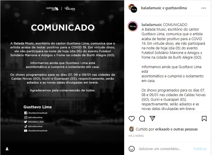 Ele cancelou ainda a participação no evento Futebol Solidário Marrone e Amigos x Fome na cidade de Buriti Alegre (GO). Segundo nota divulgada pelo escritório do cantor, Gusttavo está isolado e assintomático.