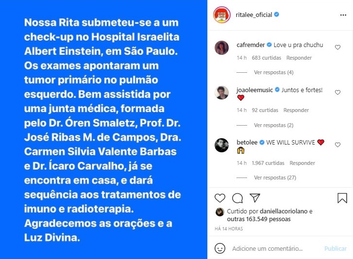 Familiares, amigos e fãs comentaram a publicação mandando mensagens de apoio para a cantora de 73 anos. Beto Lee, filho mais velho de Rita, comentou no post com: “We will survive” (nós vamos sobreviver). Já João, filho do meio, falou: “Juntos e fortes”.