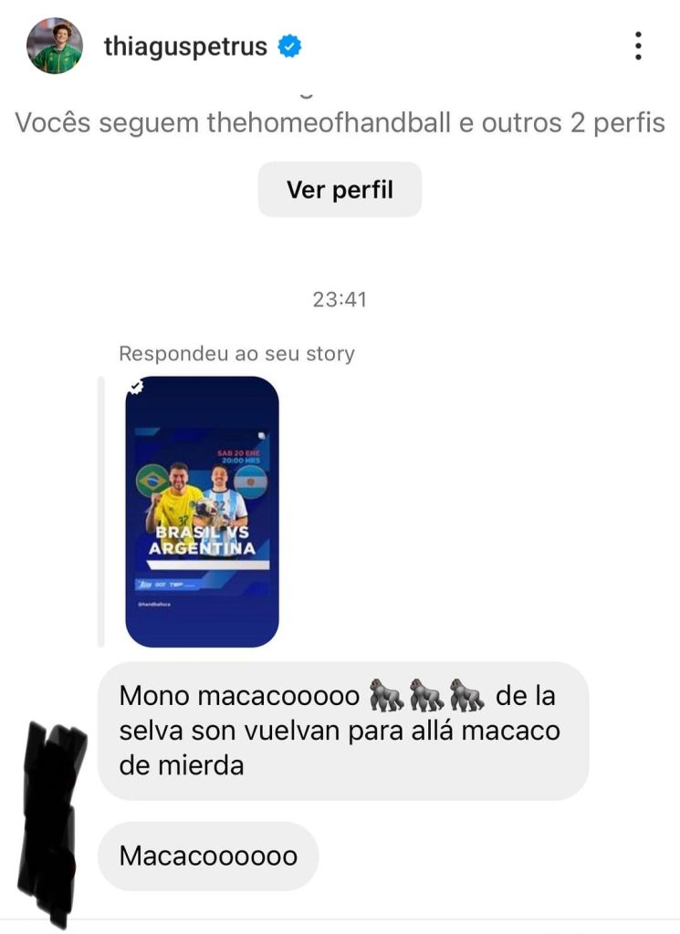 RIO DE JANEIRO (RJ) – Três dias após a seleção brasileira masculina de handebol derrotar a Argentina, em Buenos Aires, e conquistar o título do Torneio Sul-Centro Americano, Thiagus Petrus, capitão da equipe, revelou que o time foi alvo de ataques racistas (bananas arremessadas em quadra) ao final da partida e, ele próprio, recebeu ofensas racistas em mensagens publicadas por argentinos em sua conta pessoal no Instagram.