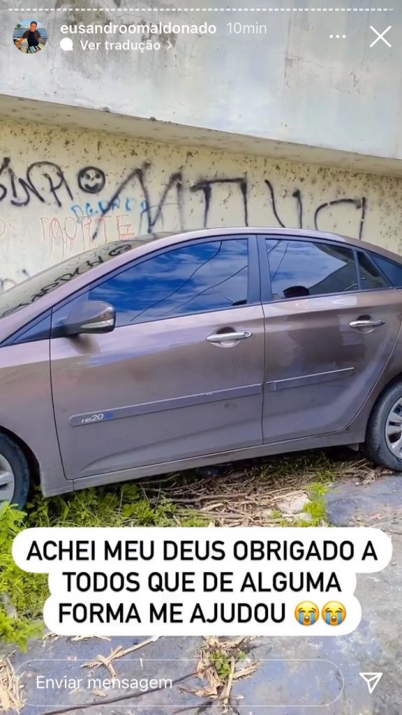 “Achei, meu Deus. Obrigado a todos que de alguma forma me ajudaram”, escreveu o influenciador, na função stories do Instagram. Maldonado está há pouco mais de um mês com o veículo, modelo HB20 Sedan, que foi furtado nas proximidades do Gargalo Sport Beer, no bairro Vieiralves, na zona Centro-Sul da capital.