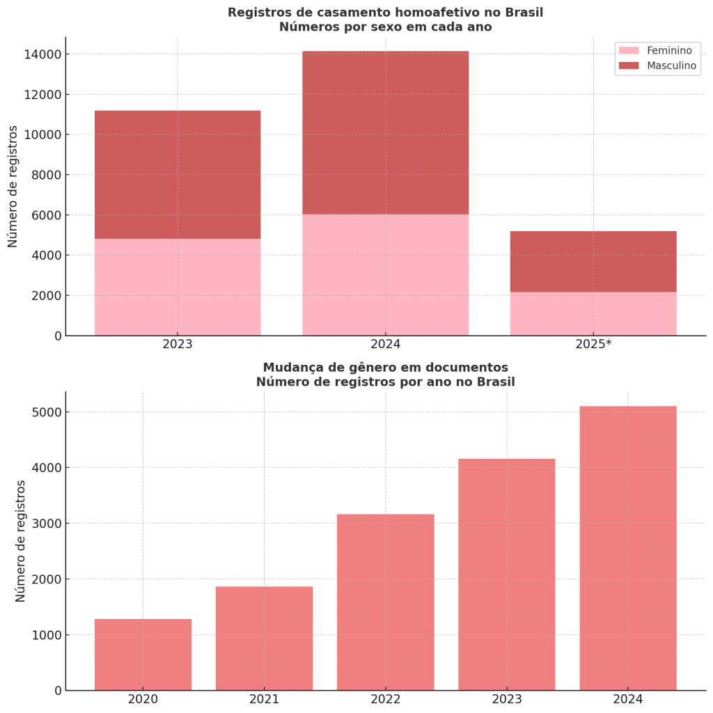 O levantamento é da Associação Nacional dos Registradores de Pessoas Naturais (Arpen-Brasil) e também mostra 5.102 registros de mudança de gênero no ano passado, uma alta de 22,8% ante os 4.156 de 2023 e quase quatro vezes o número de 2020 (1.283).