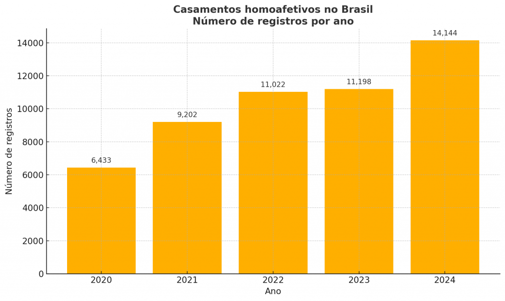 MANAUS (AM) – Os registros de casamentos homoafetivos no Brasil chegaram a 14.144 em 2024, alta de 26% na comparação com as 11.198 uniões realizadas em 2023 por cartórios de todo o país.
