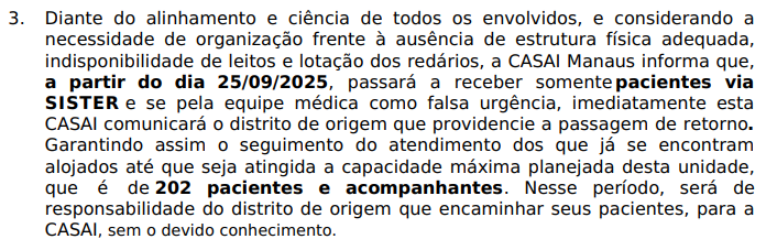 Segundo documento oficial, no dia 22 de setembro estavam alojados 354 indígenas entre pacientes e acompanhantes, enquanto a capacidade máxima da Casai é de 202 usuários. Além disso, outros 70 indígenas permanecem internados em hospitais da capital e deverão retornar à unidade após a alta, o que amplia ainda mais a situação de superlotação.