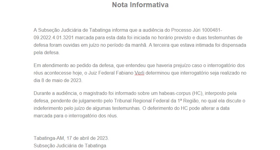 “A Subseção Judiciária de Tabatinga informa que a audiência do Processo Júri 1000481-09.2022.4.01.3201 marcada para esta data foi iniciada no horário previsto e duas testemunhas de defesa foram ouvidas em juízo no período da manhã. A terceira que estava intimada foi dispensada pela defesa“, destaca a nota.