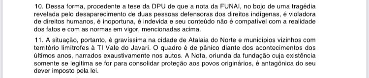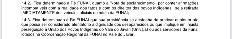 A medida da Justiça acata ao pedido da Defensoria Pública da União (DPU), que critica a Funai e a acusa de “violação aos direitos humanos” ao emitir a nota atacando a Univaja. No documento, Jaiza Fraxe cita a tese da DPU de que a nota da Fundação Nacional do Índio, “no bojo de uma tragédia revelada pelo desaparecimento de duas pessoas defensoras dos direitos indígenas, é violadora de direitos humanos, é inoportuna, é indevida e seu conteúdo não é compatível com a realidade dos fatos”.