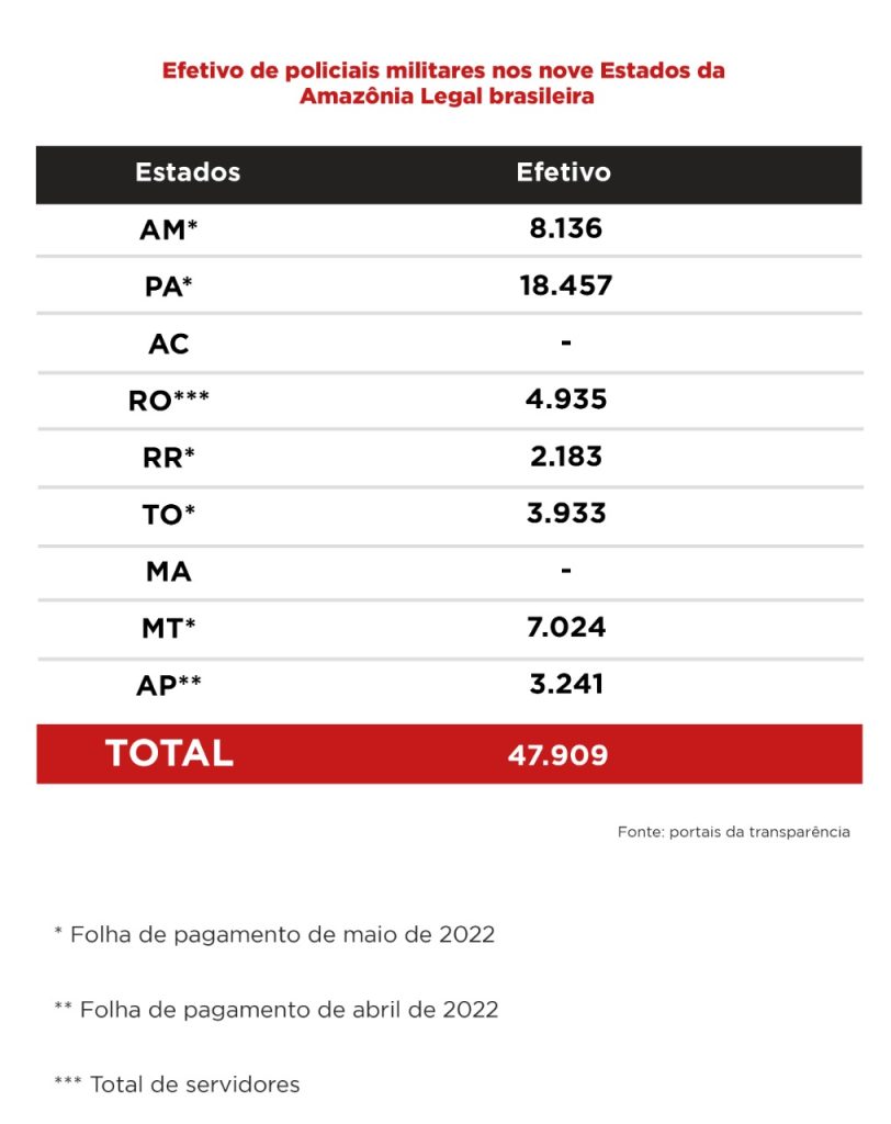 O levantamento mostrou o total de 47.909 policiais militares na região, número retirado da última folha de pagamento disponibilizada nos portais da transparência do Amazonas, Pará, Amapá, Rondônia, Roraima, Mato Grosso e Tocantins. Os Estados do Acre e Maranhão não disponibilizaram os dados. Os sites governamentais, porém, não detalham quanto desse efetivo cumpre serviço administrativo e quanto está diretamente nas ruas. Cada Estado mencionado foi questionado sobre o detalhamento dos dados, ou sobre a falta deles, nos portais da transparência, mas não houve retorno até a publicação desta matéria.