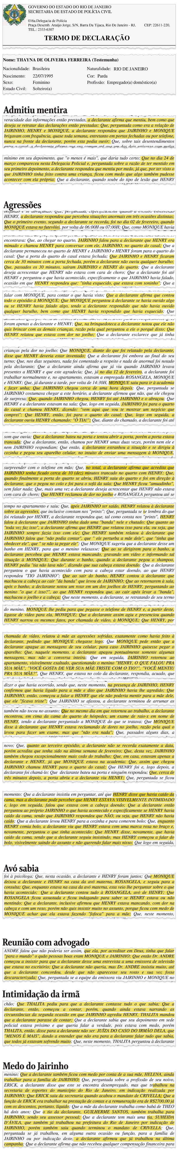 “Monique então começou a falar para a declarante que quando ela fosse depor em sede policial era para ela falar que nunca havia visto nada, que nunca havia ouvido nada e que era para apagar todas as mensagens (…) Que Monique mandou a declarante não relatar nada, nem sobre as brigas do casal, nem sobre as agressões que Henry sofreu”, diz trecho do depoimento.
