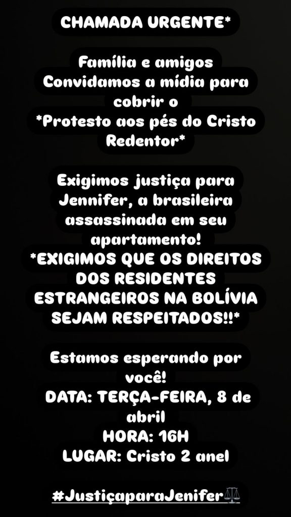 “Exigimos justiça para Jenife, a brasileira assassinada em seu apartamento. Exigimos que os direitos dos residentes estrangeiros na Bolívia sejam respeitados“, consta na publicação da mobilização.