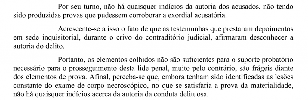 De acordo com a decisão assinada pelo juiz de Direito Fábio Lopes Alfaia, “não há quaisquer indícios da autoria dos acusados, não tendo sido produzidas provas que pudessem corroborar a exordial acusatória”. O juiz aponta ainda que “os elementos colhidos não são suficientes para o suporte probatório necessário para o prosseguimento deste lide penal, muito pelo contrário, são frágeis diante dos elementos de prova”.