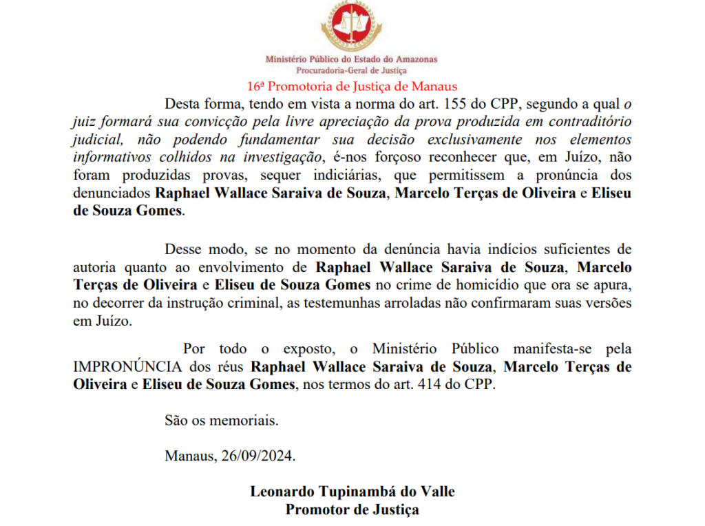 O MP-AM, que recomendou a impronúncia dos acusados e foi acatado pelo Poder Judiciário, afirmou nos autos do processo n° 08.2020.00032811-0, nas alegações finais, que a base da decisão partiu de uma série de fatores, bem como a afirmação das testemunhas de defesa e acusação, que alegaram desconhecer a autoria do delito. Além disso, os acusados Raphael, Marcelo e Eliseu negaram a autoria do homicídio durante interrogatório judicial.
