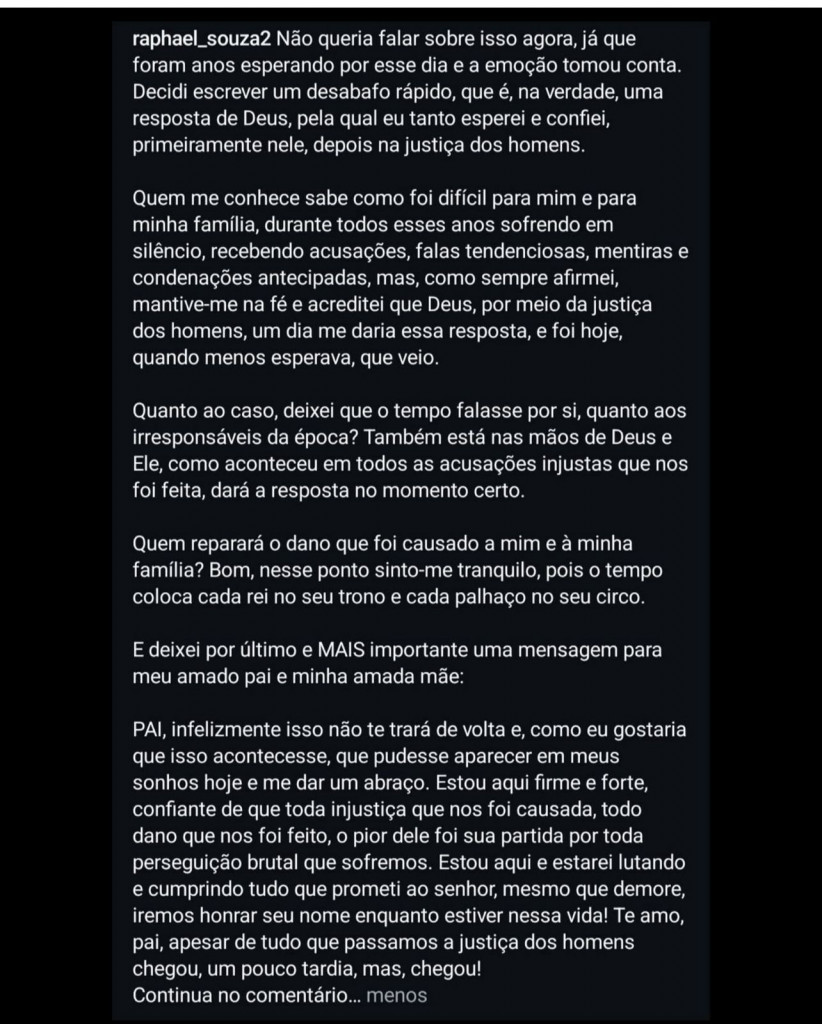 No Instagram, Raphael Souza escreveu sobre a decisão de impronúncia do crime e citou os anos em que esperou para provar sua inocência. Ele também relata o passado com o pai e o que chamou de “perseguição brutal” sofrida pela família ao longo dos anos.