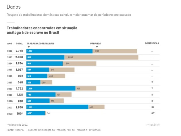 PERUÍBE (SP) — O resgate de trabalhadores domésticos em condições análogas à escravidão tem aumentado, segundo dados do Ministério do Trabalho e Previdência. Em 2021, a pasta registrou 31 casos, maior número desde 2017, quando passaram a ser separados registros dessa modalidade. De um lado, o fato de esses crimes ocorrerem dentro de casa dificulta as denúncias e a fiscalização. De outro, o longo tempo de segregação das ruas que caracteriza esses registros de trabalho escravo torna mais desafiadora a reinserção social após a liberação das vítimas.