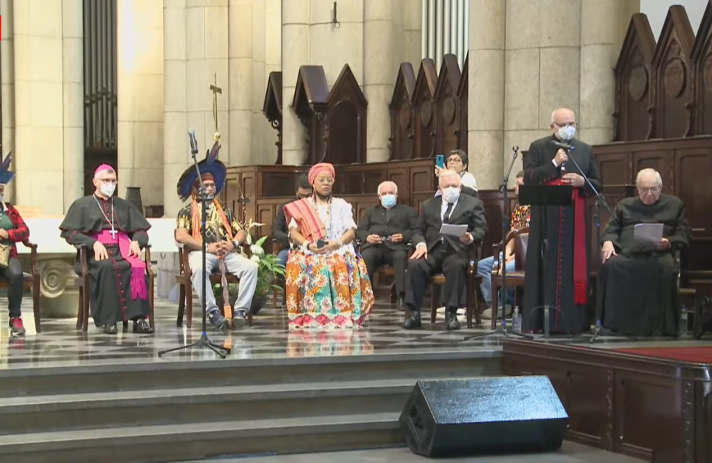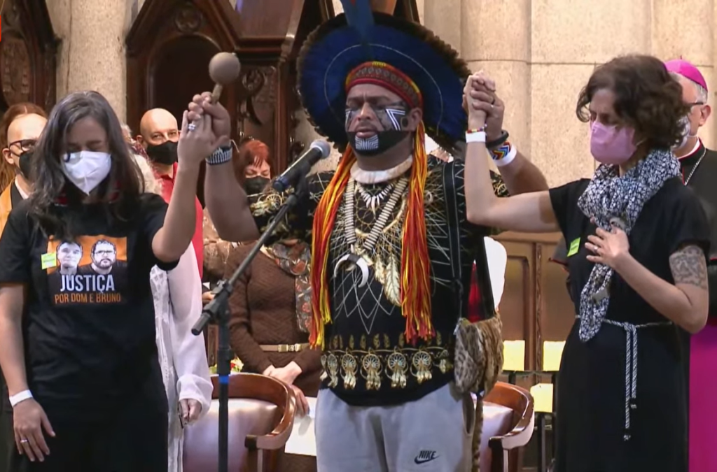 “Un acto interreligioso homenajea a indígenas y sus defensores en la Catedral da Sé – São Paulo. Están presentes Beatriz Matos y Alessandra Sampaio, esposas de Bruno y Dom, asesinados recientemente cuando cubrían invasiones contra comunidades indígenas amazónicas.”