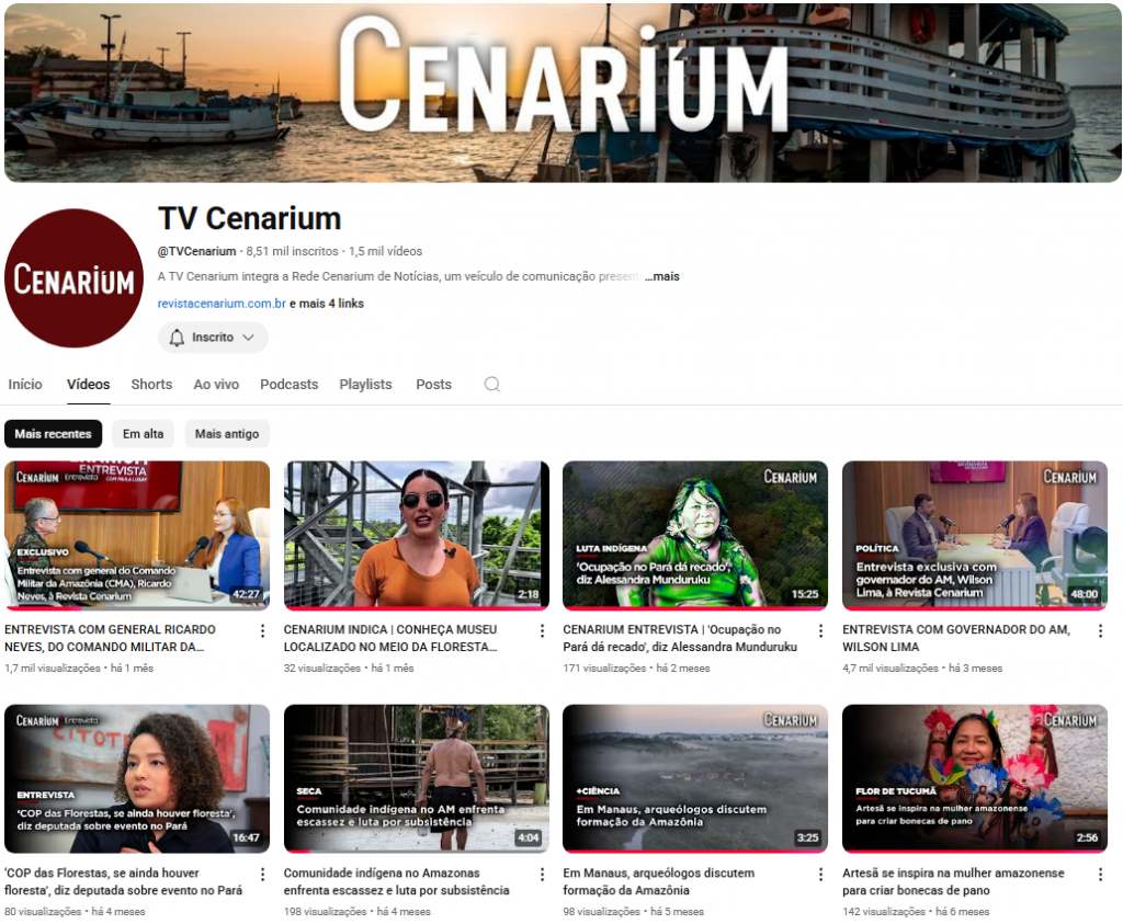 A TV CENARIUM, que faz parte da REDE CENARIUM e está disponível no YouTube, se destaca pela produção contínua de reportagens exclusivas, entrevistas, minidocumentários e documentários. Entre os anos de 2020 e 2025, a plataforma mantém uma média de 18 horas de conteúdo publicado.