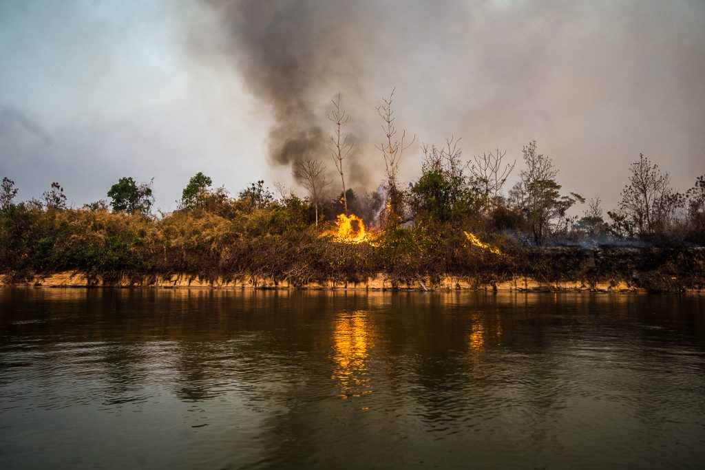 Voltamos o rio e já há novos focos que não estavam lá a cinco minutos. Os focos menores que deixamos atrás de nós estão gigantes. Miguel Ângelo me explica que tudo que está queimando é área de proteção ambiental. Eu fico sem entender, já que têm vários pontos de acampamento de pescadores pegando fogo com bancos para sentar, freezers e até cabanas de madeira para pernoitar.